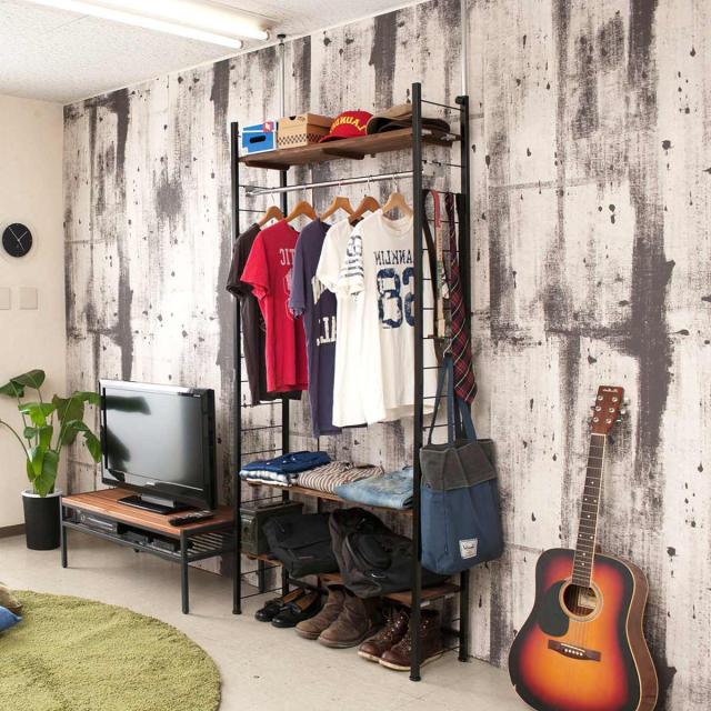 雰囲気のある古木を使って作られたような壁面収納「ハンガータイプ」です。工事不要で簡単に設置できる突っ張り式なので、賃貸のお部屋にお住まいの方にもおすすめです。マットなブラックスチールと天然杉の棚板がヴィンテージ感漂う空間を作り出します。