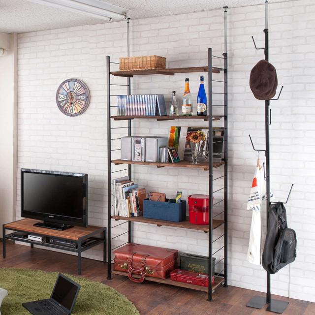 天然木を棚板に使用したヴィンテージな風合いの突っ張り壁面収納
