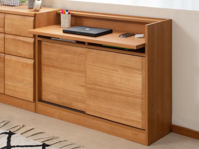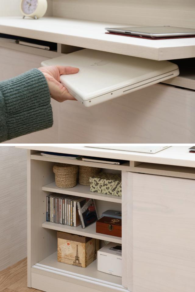 ノートパソコンや書類を収納するスペースがあり、スムーズに出し入れができます。また、引き戸式の扉は、座ったままでも扉の開閉ができ、中にはたっぷり収納ができます。