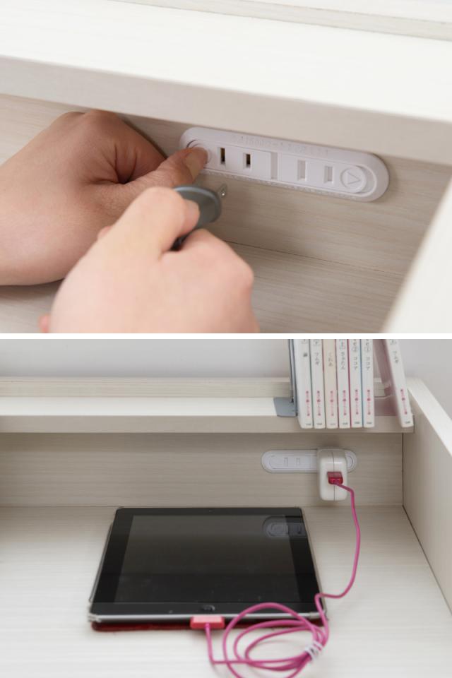 スマートフォンやタブレットなどを充電できる便利なコンセントが、天板下に2口付いています。ホコリの侵入を防ぐスライド式です。
