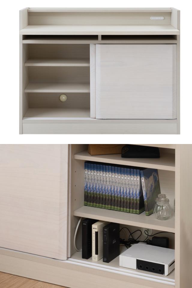 扉内には便利なコード穴が付いているので、ルーターやプリンタ機器の収納もできます。棚板うしろに1cmのすき間があり、上下の配線がしやすいです。扉の中は左右対称なので、棚板はどちら側でも使えます。