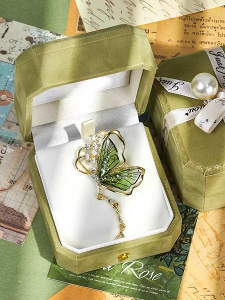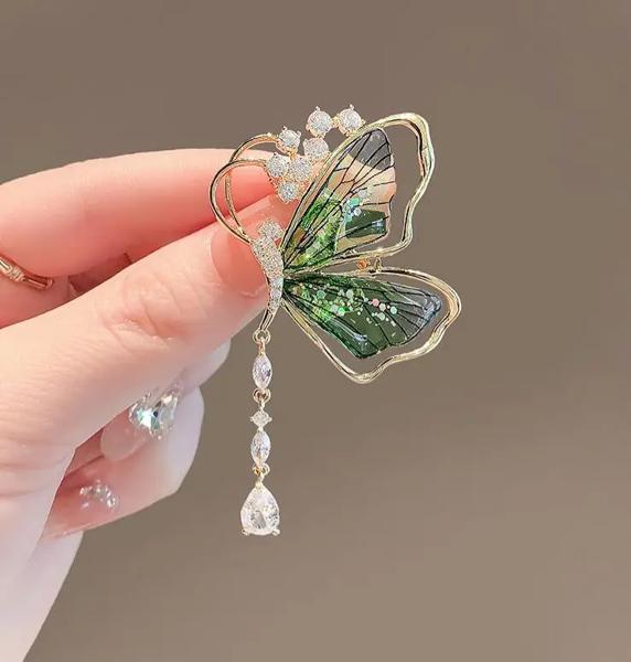 絶妙なグリーンクリスタルバタフライブローチ、メタルラペルピン、セーターバッジ、ジュエリーアクセサリー、女性と女の子へのギフト