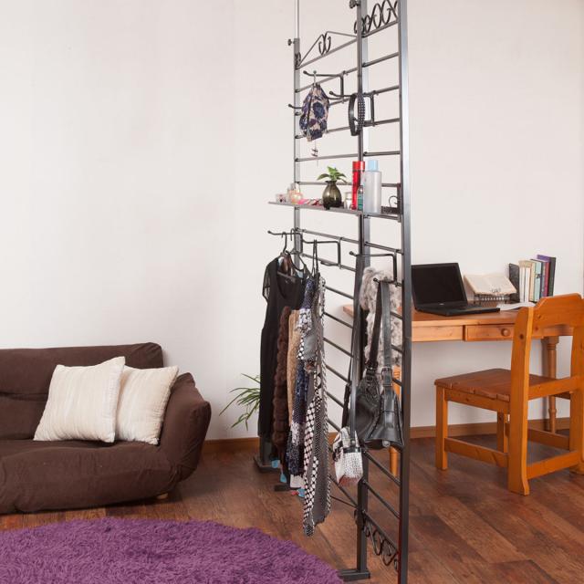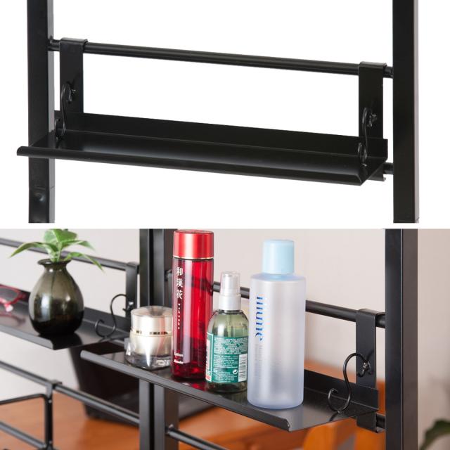 壁面収納としてだけではなく、お部屋の間仕切りとしてもご使用いただけます。スチール製のラダーは、圧迫感を与えずに空間を仕切ることができます。付属のフックや棚は両面に掛けられます。