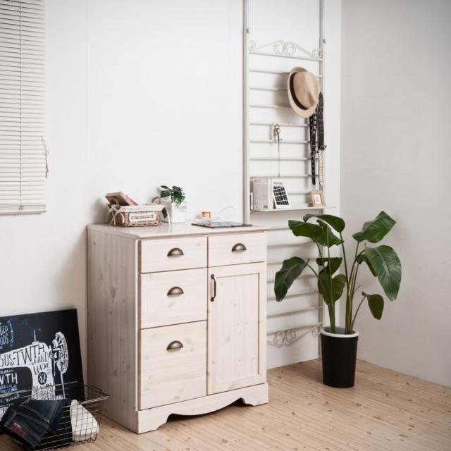 鍵や一輪挿しを置いたり、絵をディスプレイできる棚が1枚付いています。前後のフチが立ち上がった仕様なので、置いたものが落ちにくく安心です。また、両サイドにもカールデザインが施されており、こちらもストッパーとしても役立ちます。