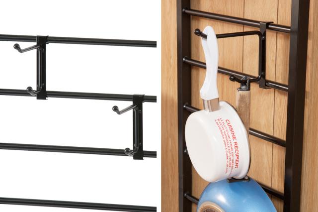 フライパンやハンガーなどを掛けられる、上下ダブルフックが3個付いています。ラダー部分の好きな場所に移動できます。