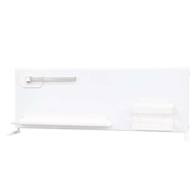 ホワイトカラーとシンプルなデザインが場所を選ばず、どんなテイストのお部屋でも使いやすいです。幅90cmハイタイプのマグネットボード、ロングトレイ、幅広小物ホルダー、ふきん掛けの4点セットです。