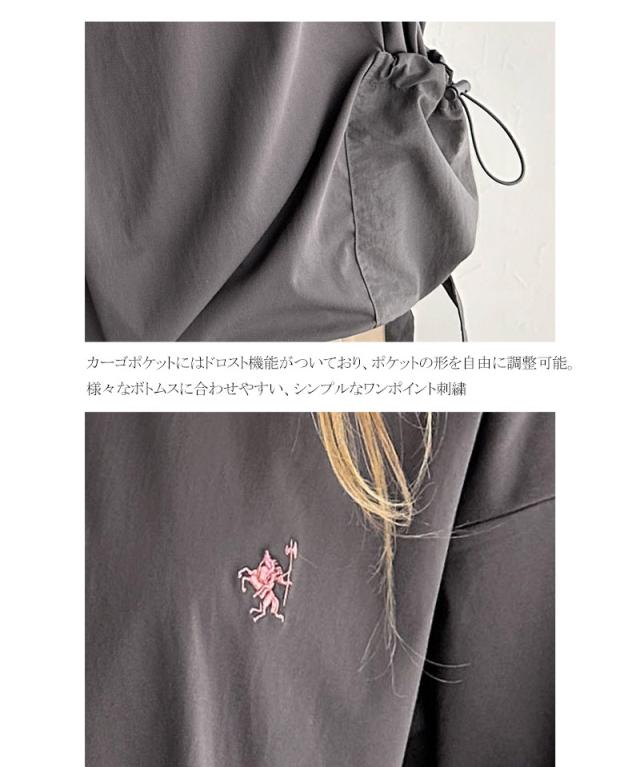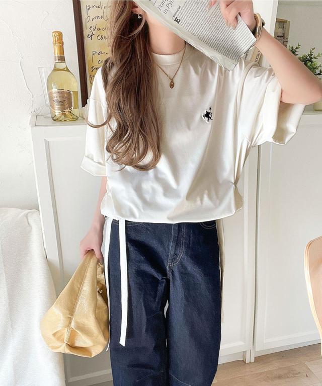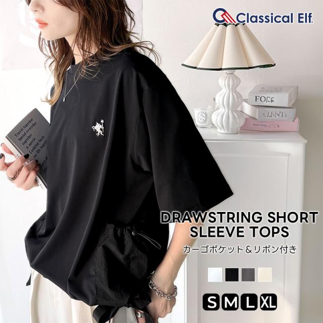 ★ゆるっとシルエットカジュアル。カーゴポケット&リボン付きワンポイント胸刺繍ドロスト半袖トップス★