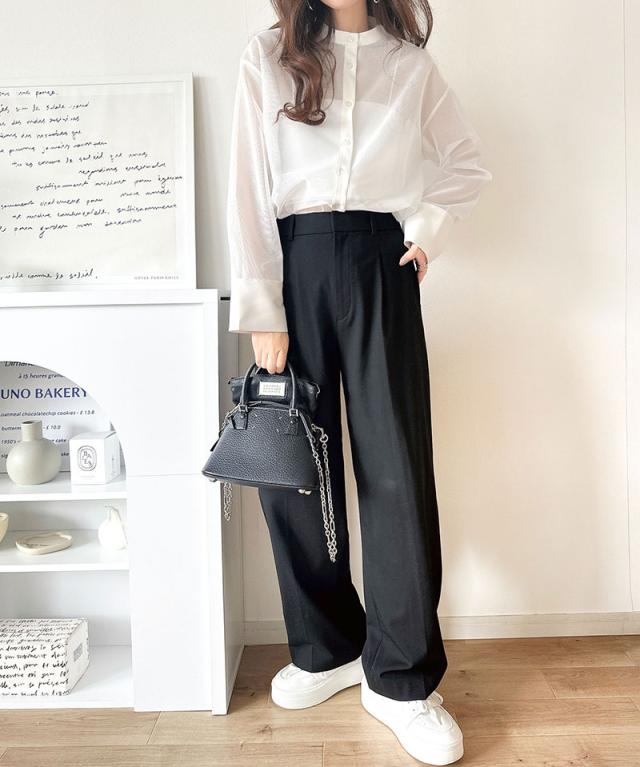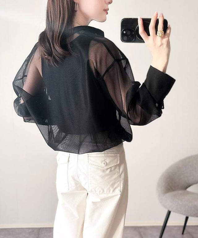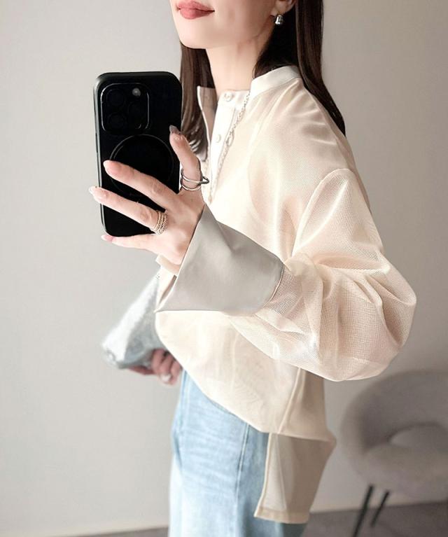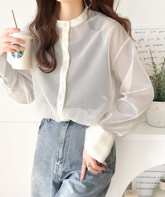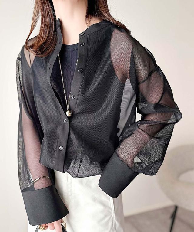 上品なバンドカラー×メッシュ素材で抜け感たっぷり。