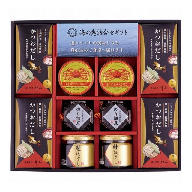 現品サイズ・内容:かつおだし(4g×8袋)4個・鮭ほぐし50g・のり佃煮80g各2瓶・紅ずわいがにほぐし身55g×2缶