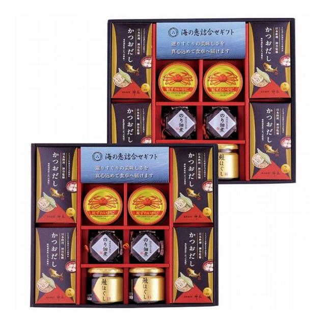 現品サイズ・内容:かつおだし(4g×8袋)8箱・鮭ほぐし50g・のり佃煮80g各4瓶・紅ずわいがにほぐし身55g×4缶