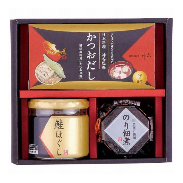 現品サイズ・内容:かつおだし(4g×8袋)1個・鮭ほぐし50g・のり佃煮80g各1瓶