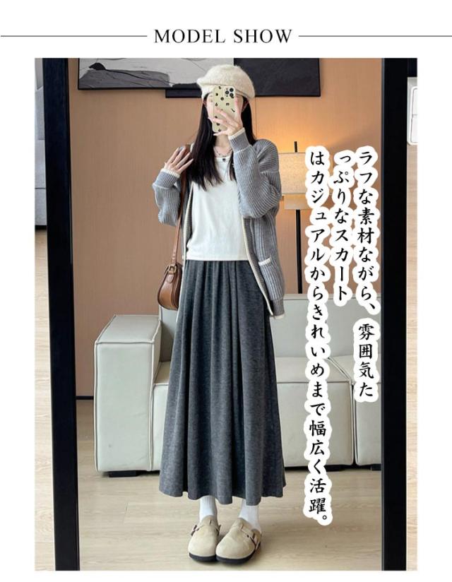 | 毎日でも着たくなるスウェットスカート。 ラフな素材ながら、雰囲気たっぷりなスカートはカジュアルからきれいめまで幅広く活躍。 裾に向かって程よく広がるフレアシルエット、柔らかい素材で、足がすっぽり隠れる長さのロングスカートは、大人のリラックスカジュアルにぴったりなアイテムです。 ウエスト部分はゴム仕様で楽チン。サイドポケット付きなのも嬉しいポイントです。 | |