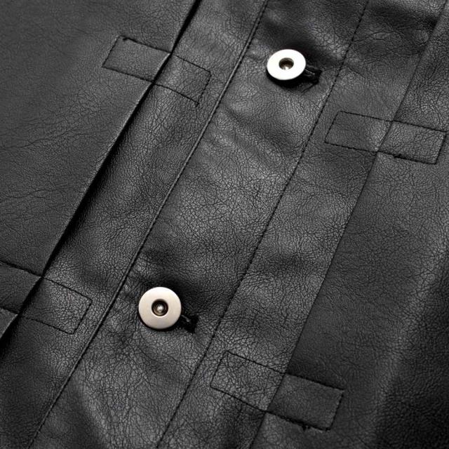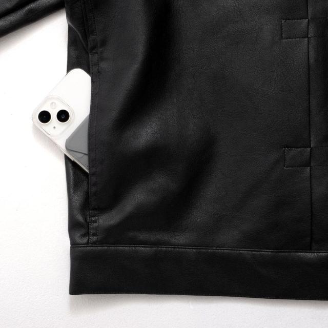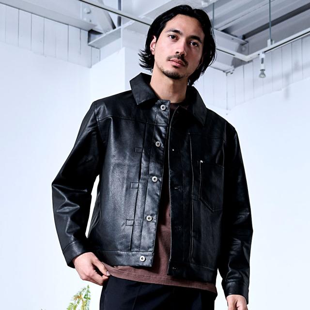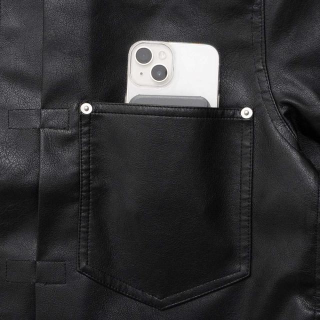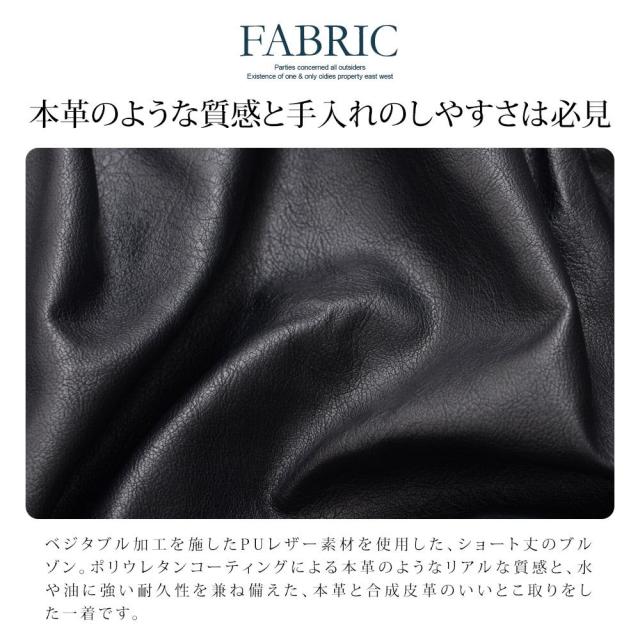 ポリウレタンコーティングによる本革のようなリアルな質感と、水や油に強い耐久性を兼ね備えた、本革と合成皮革のいいとこ取りをした一着です。