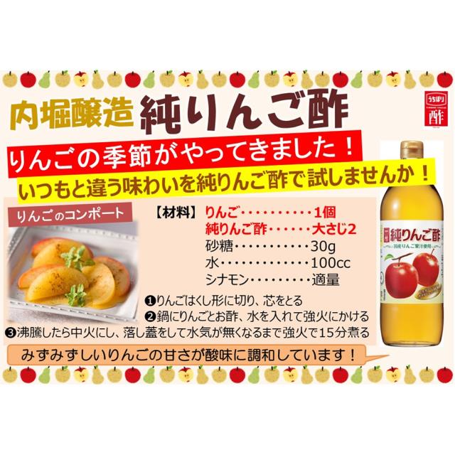 商品名 内堀醸造 純りんご酢 900ml×2本 容量 900ml×2本 原材料名 りんご果汁(国内製造) アレルギー特定原材料 − 賞味期限 商品の発送時点で、30日以上あるものをお届けいたします 保存方法 開栓後はキャップをしっかり閉めて冷暗所に保管してください。