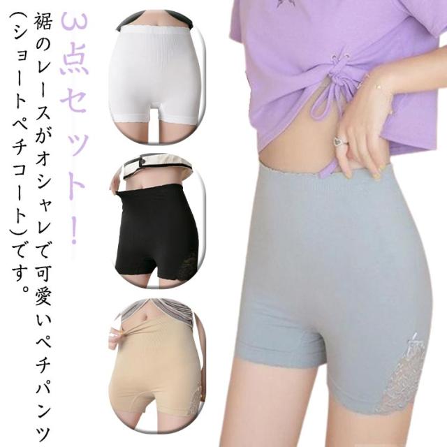 ペチパンツ レディース シンプル ペチパン インナー ペチコート ショート ペチパン 透けない 3足セット パンツ ショートパンツ 裾レース チラ魅せ ホットパンツ キュロット 薄手 3足セット 透け防止 インナー 部屋着 ルームウェア パンツ 秋 春 夏 透けない