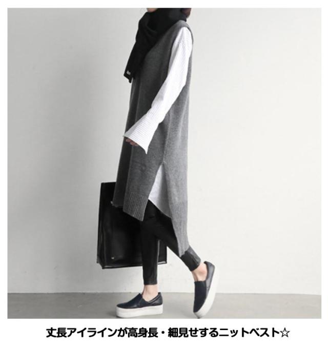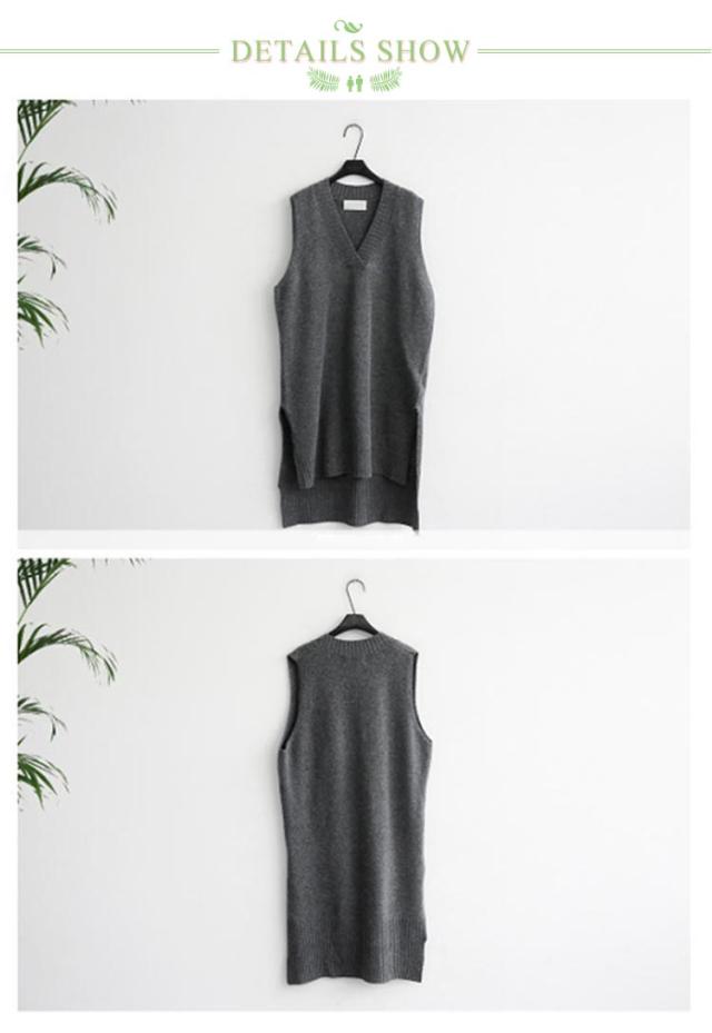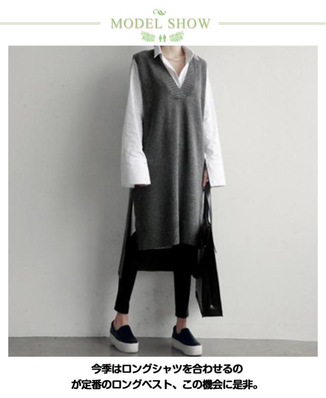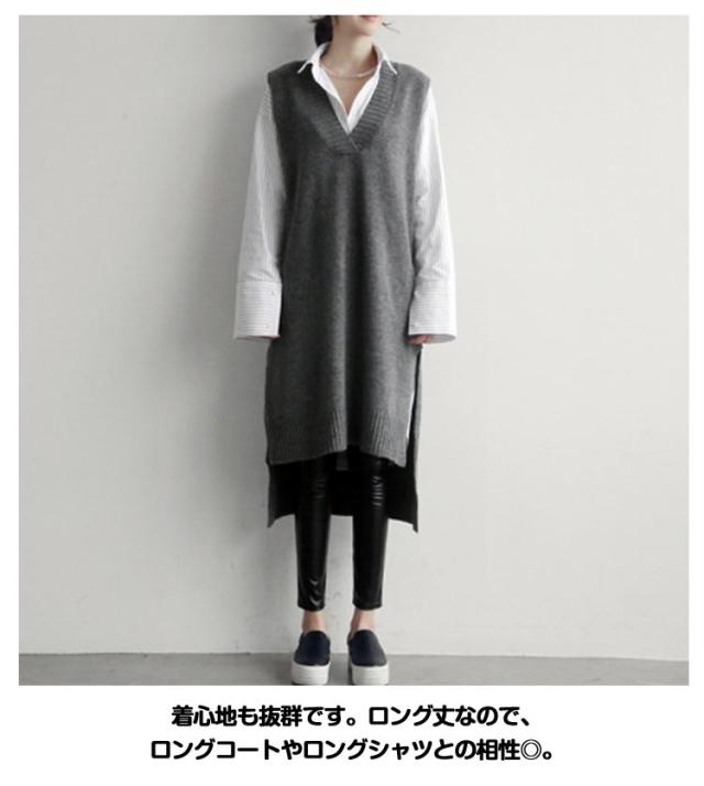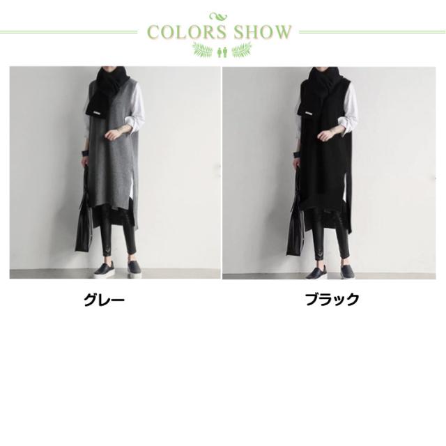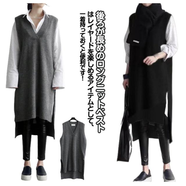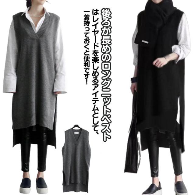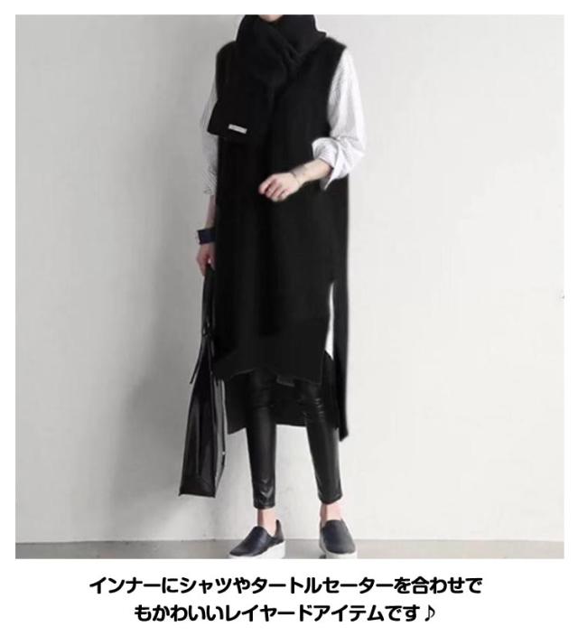 無地 ロングベスト ワンピース ノースリーブ Vネック ロング丈 体型カバー ニットベスト ベスト プルオーバー サイドスリット 前後差 レディース 秋冬 春 大人 おしゃれ ベスト 通勤 30代 40代