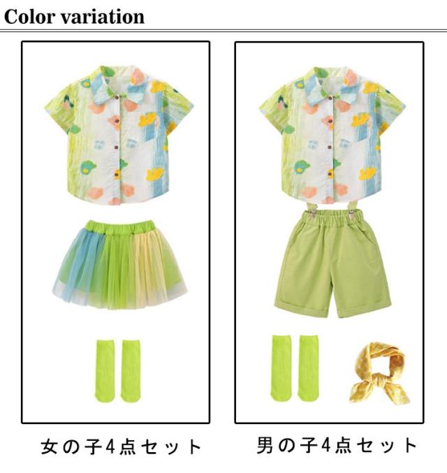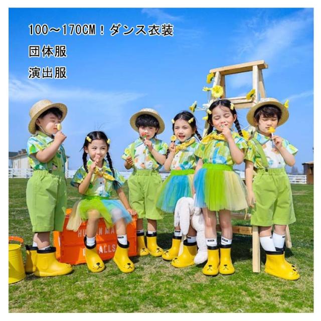 キッズ 緑 スカートセット ダンス衣装 文化祭 団体服 セットアップ パンツセット 舞台 男の子 女の子 ダンス服 グリーン 子ども 4点セット 子供 子供服 体育祭 キッズ 学園祭 応援団 公演服 クラス活動 学生 運動会 幼稚園