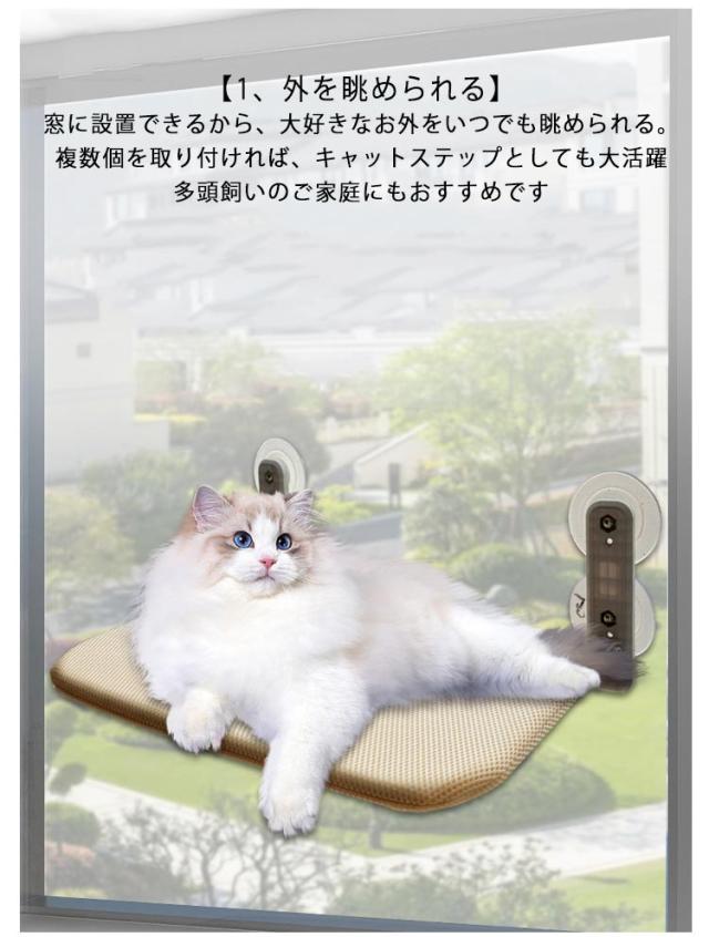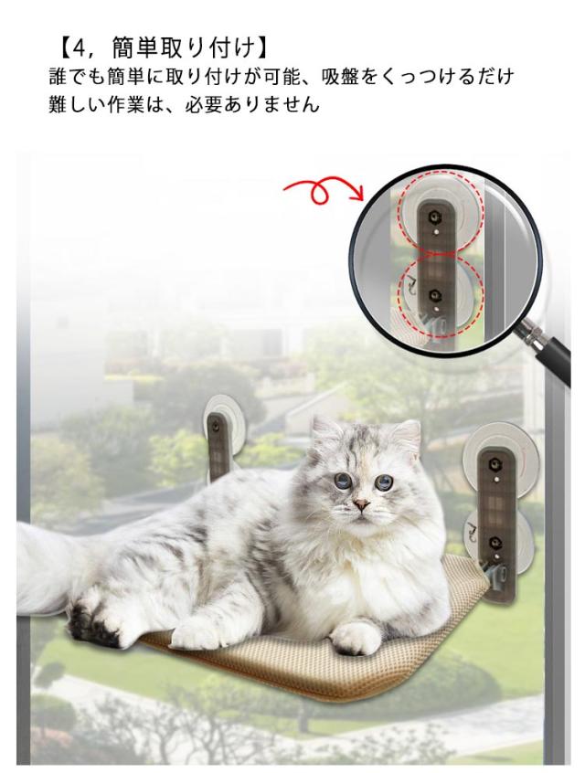 | 【1、外を眺められる】 窓に設置できるから、大好きなお外をいつでも眺められる。 複数個を取り付ければ、キャットステップとしても大活躍 多頭飼いのご家庭にもおすすめです 【2,お好きな場所に設置可能】 どこでもお好きな場所に設置可能。 ・取付場所例:窓、凸凹の無いツルツルしたタイルや壁 ・高い場所が好きな猫ちゃんにピッタリ 【3,安定感が抜群】 強力な吸盤で、ピタッと固定。 グラつかず、安定感が抜群です 耐荷重:(約)15kg 【4,簡単取り付け】 誰でも簡単に取り付けが可能、吸盤をくっつけるだけ 難しい作業は、必要ありません 【5,折り畳みが可能】 使わない時は、折り畳んで収納が可能。 カーテンの邪魔をしないので、とっても便利 カバーは取り外してお洗濯ができるから、ずっと衛生的に使えます。 (※洗濯機でお洗濯をする場合は、洗濯ネットに入れてのご使用をおすすめいたします。) | |