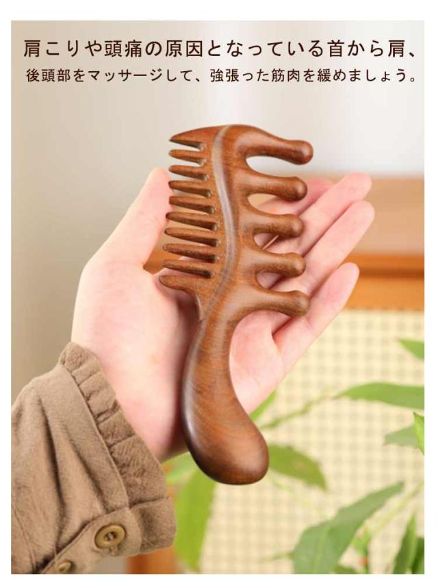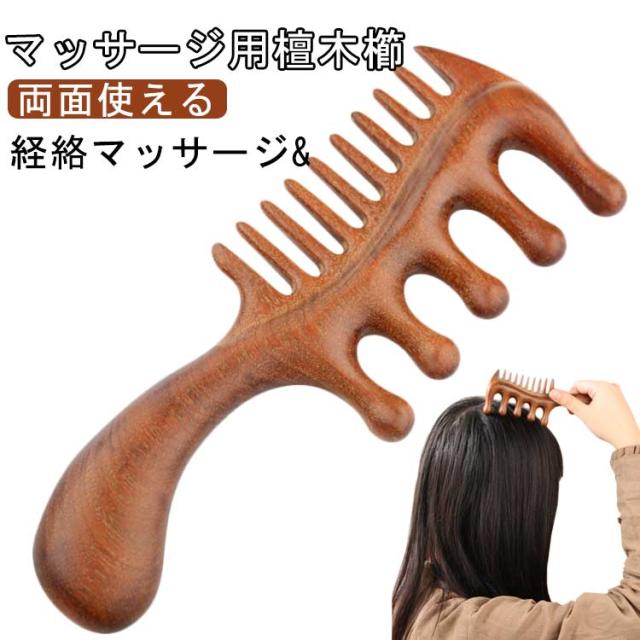 | マッサージ用檀木櫛 両面使える 経絡マッサージ& 頭や顔、肩、腕、足など全身に使えるマッサージ用檀木櫛。 ツボと経絡の通りを良くすることにより、頭部の血行を促進して脱毛を防ぎ、髪の栄養不良を防止してくれます。 肩こりや頭痛の原因となっている首から肩、後頭部をマッサージして、強張った筋肉を緩めましょう。 天然木なので静電気が起きにくく髪へのダメージを抑えます。 軽量で、携帯に便利なので、どこてもいつでも使えます。 | |