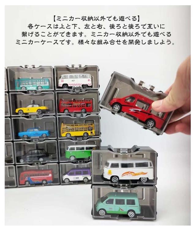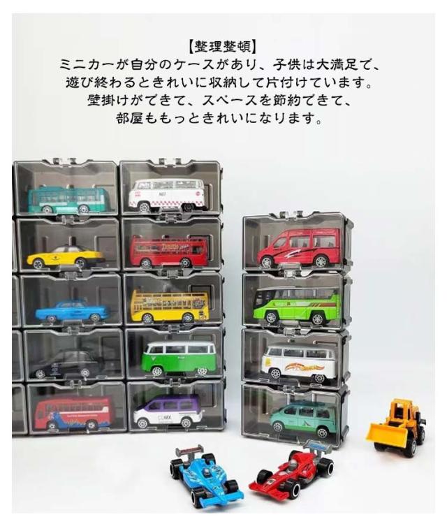 | 1台ずつ保管するのミニカー収納ケース。【30個セット】 【ミニカー収納】ミニカーケース30個セットです。ミニカー収納ケースは、1台ずつ保管します。また、透明度高い蓋があり、展示した際にもミニカーをきれいに見ることができます。使用上の注意:ミニカーのトップからタイヤまで3.3cmを超えません、前から後ろまで8.4cmを超えません、その以外のサイズ入れません、ご注意ください。 【ミニカー収納以外でも遊べる】各ケースは上と下、左と右、後ろと後ろで互いに繋げることができます。ミニカー収納以外でも遊べるミニカーケースです。様々な組み合せを開発しましよう。 【整理整頓】ミニカーが自分のケースがあり、子供は大満足で、遊び終わるときれいに収納して片付けています。壁掛けができて、スペースを節約できて、部屋ももっときれいになります。 【ミニカーを保護する】ミニカーケースを使うことでほこりと傷を防ぐことができます。樹脂ミニカーケース角のないデザインは、ミニカーだけでなく、子供も守ります。蓋があり、取りやすくして車が落ちないようにします。 【壁掛け】背面に壁掛け穴があり、ディスプレイでなく壁掛けも可能です。※写真中のミニカーは別売りです。 | |