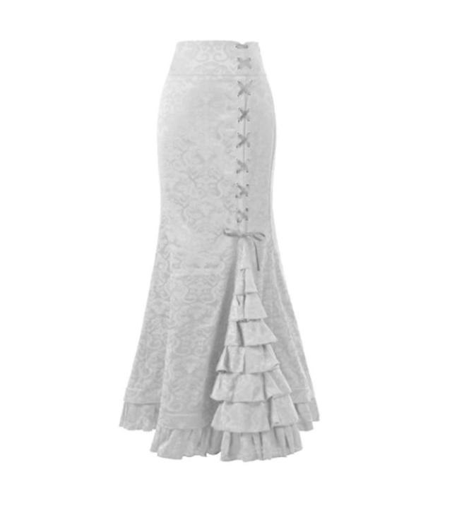 | マーメイドシルエットとレースアップデザインが女性らしいロングスカート。 裾のティアードが動くたびに上品に揺れ動く綺麗めシルエットのスカート。 程よい広がりのマーメイドスカートでスタイルアップ効果も叶います! 高級感のあるジャガード柄がコーデの主役に シンプルなトップスと合わせるだけでスタイリングが決まります。 | |
