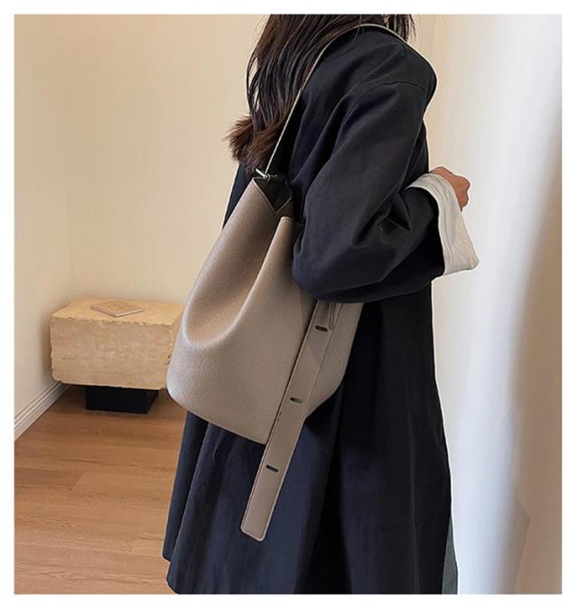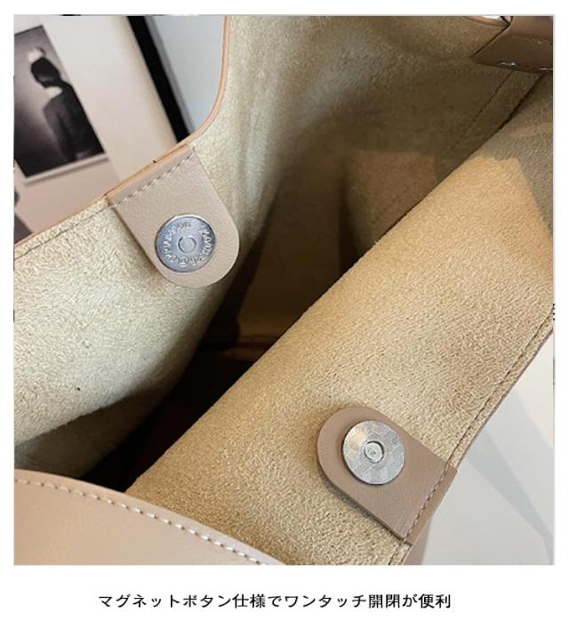 | お出掛けに便利なバケツ型PUレザーのバッグ。 やわらかく丈夫なフェイクレザー生地で上品に仕上げた。 普段使いにちょうどいい絶妙なサイズ感で開口部が大きく荷物の出し入れもスムーズに! マグネットボタン仕様でワンタッチ開閉が便利! マチ広+小物の整理に便利なインナーバッグ付きで見た目以上にたっぷり収納できます。 オールシーズン使えて、オンオフいつでも活躍してくれるデイリーバッグ ! | |