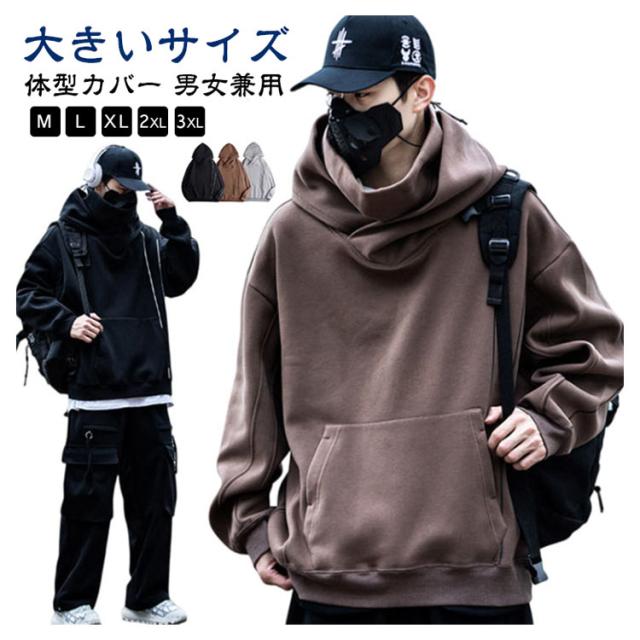 ボリュームネック ヒップホップ フード付き レディース スウェット 春秋 プルオーバー ハイネック メンズ オーバーサイズ ゆったり パーカー ストリート系 モード系 原宿風 男女兼用 大きいサイズ 厚手