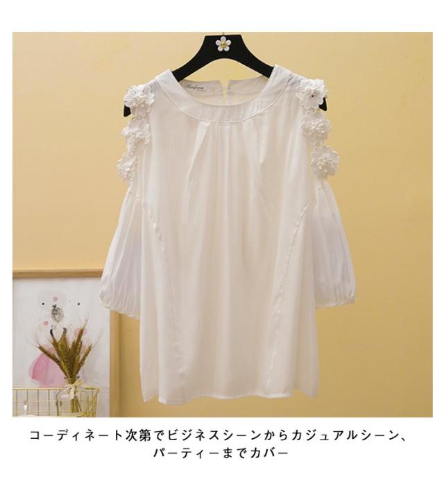 | M-2XL!オープンショルダーの大人可愛いスタイルが完成するシフォンブラウス 花柄で華やかな女性らしい印象になります コーディネート次第でビジネスシーンからカジュアルシーン、パーティーまでカバー 襟周りや肩が見えるデザインで女性らしく可愛いデザイン。 ミセスからOLまた、30代 40代 50代に大人気です。 | |