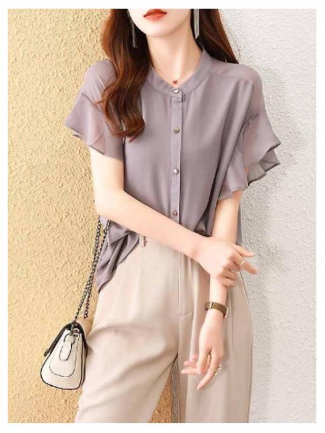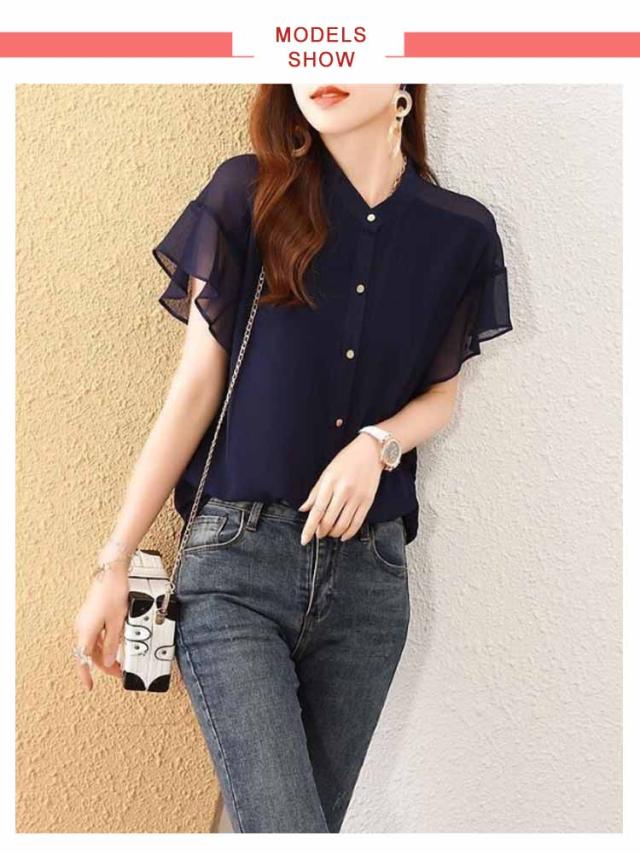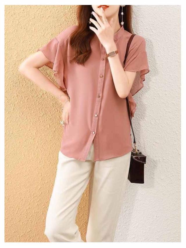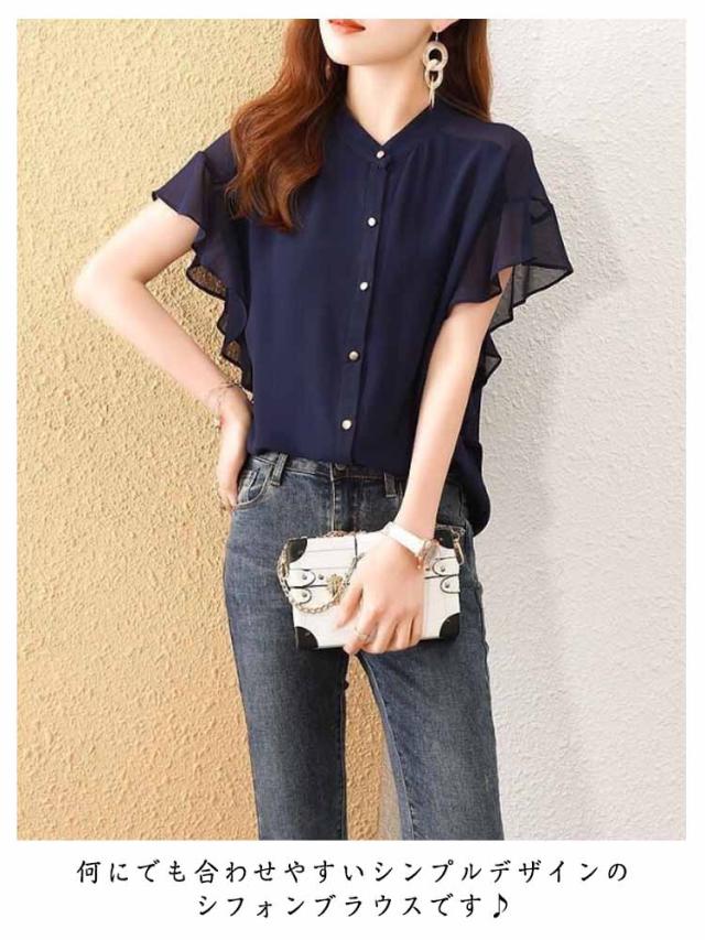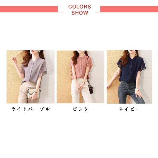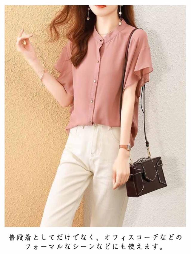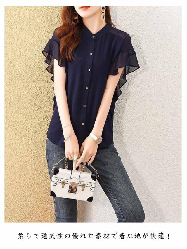 春夏 半袖 半袖ブラウス フレアスリーブ トップス ブラウス シャツ 薄手 フレア袖 前開きシャツ 夏コーデ フリル 無地 きれいめ フォーマル OL オフィス カジュアル 通勤 ブラウス 結婚式 パーティー 二次会 大人女性 大きいサイズ ノーカラー