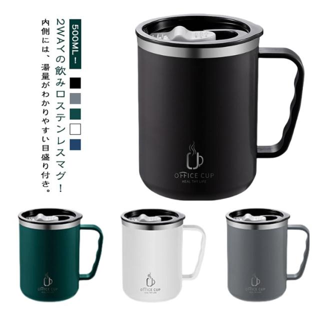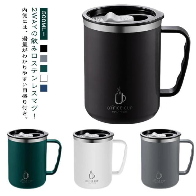 | 500ML!2WAYの飲み口ステンレスマグ! 内側には、湯量がわかりやすい目盛り付き。 真空二重構造で、冷たい飲み物も温かい飲み物も、しっかり適温キープ。 蓋つきで、中身がこぼれにくく持ち運びも楽々。 温度をキープするフタは、飲み分けができる2WAYの飲み口になっているのもポイント。 おうちでのリラックスタイムや、オフィスでマイカップにおすすめ。 | |