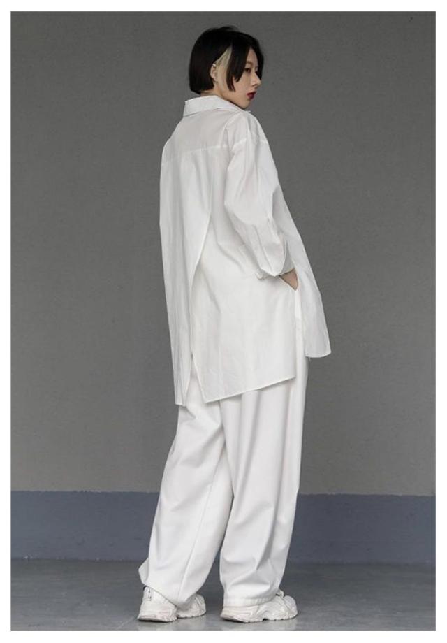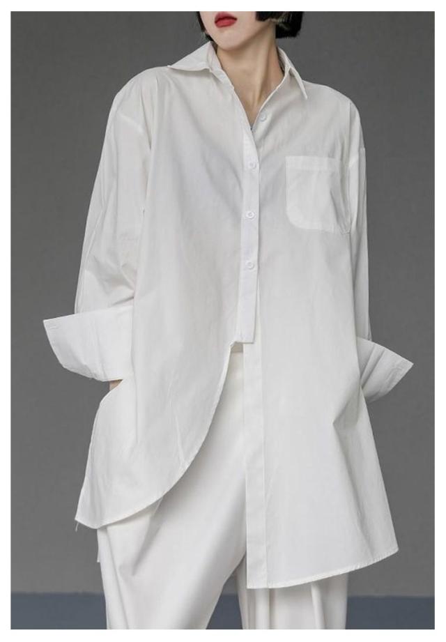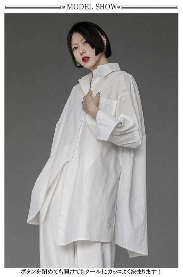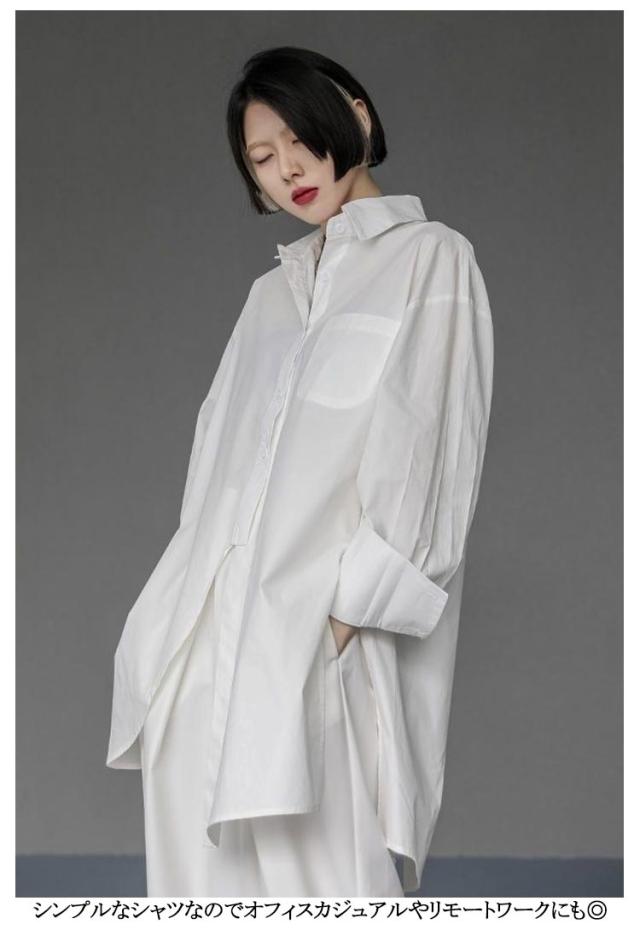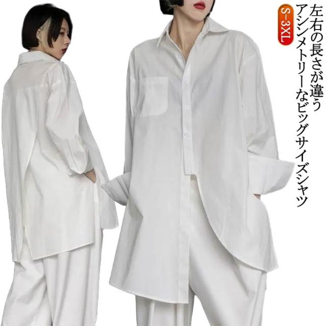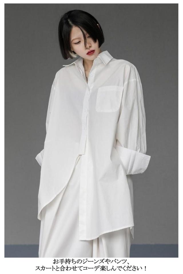 | 左右の長さが違うアシンメトリーなビッグサイズシャツ ボタンを閉めても開けてもクールにカッコよく決まります! シンプルなシャツなのでオフィスカジュアルやリモートワークにも◎ お手持ちのジーンズやパンツ、スカートと合わせてコーデ楽しんでください! | |