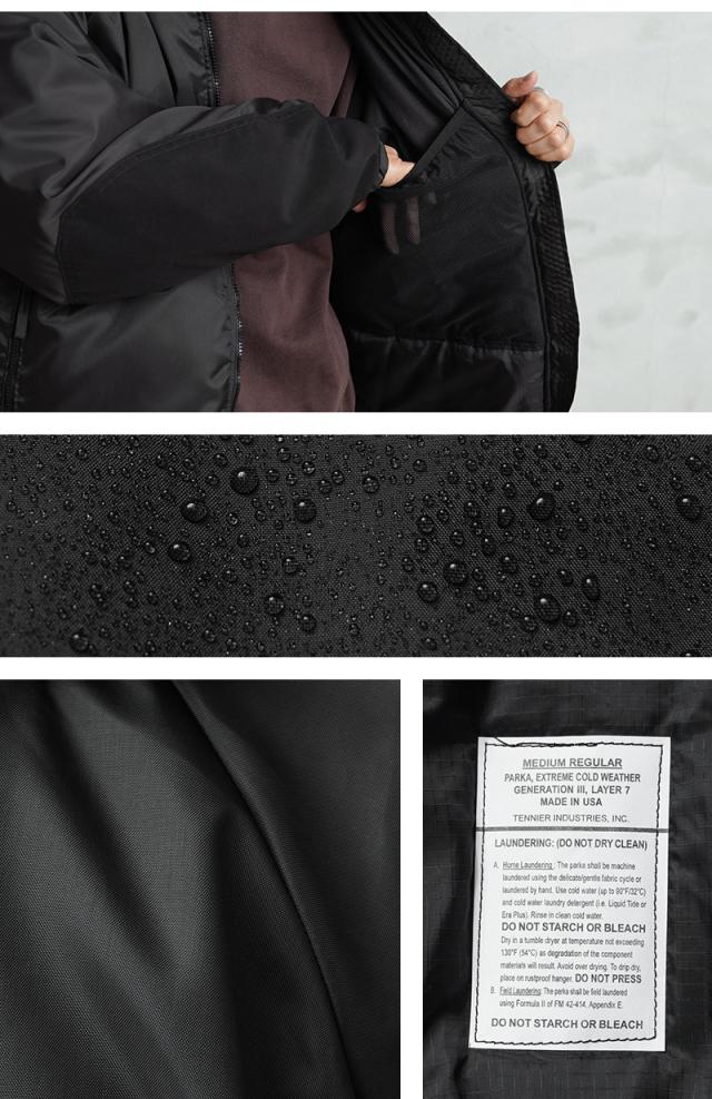 | 商品説明 | TENNIER INDUSTRIES社製 米軍 ECWCS GEN III LEVEL 7 ジャケット Climashield® APEX BLACK MADE IN USA のご紹介です。 冬の定番ミリタリーアウターとして絶大な人気を誇る米軍のECWCS GEN III LEVEL7 ジャケット。 米軍に納入実績のあるTENNIER INDUSTRIES社が生産するミルスペック規格に準じた民間向けに販売されたモデルが入荷しました。 米軍 ECWCS 第三世代(ジェネレーション3)は7種類のトップスと5種類のボトムから構成された、様々な気候やシチュエーションに対応するレイヤリングシステムです。LEVEL7はレイヤリング最終防寒アウターとして位置づけられており、収納式のフードや、ポケット内蔵の裾ドローコードやエルボーパッチなどのディテールが特徴です。 表地にはシェルは撥水性と強度を備えたドライタッチでシャリ感のある生地を採用。 また、中綿素材には従来のモデルで採用されていたPrimaloftに対し、Climashield® APEXを採用しています。1平方ヤードで6ozと非常に肉厚な中綿を使用しており、極寒地での着用を想定したアウターとして非常に頼もしいクオリティーとなっています。 TENNIER INDUSTRIES社は米軍への納入はもちろん、退役軍人やアウトドアの愛好家に向けて、アレンジを加えたミリタリー、タクティカルアイテムを多く手がけています。 機能性とデザイン性を兼ね備えた一着をお探しの方に、ぜひおすすめしたい逸品です。 MADE IN USA | |||||||||||||||