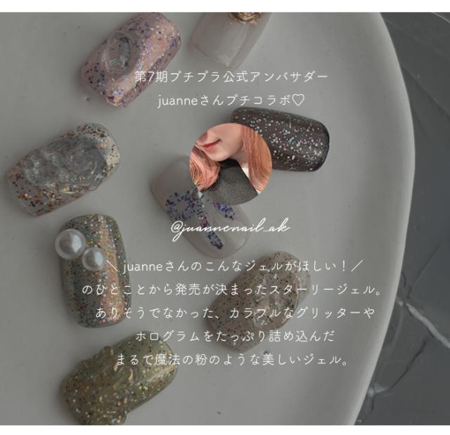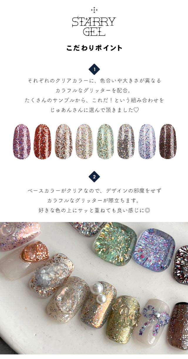 カラフルなグリッターやホログラムが配合された 一味違ったキラキラ感。 それぞれ違うクリアカラーのベースに、色合いや大きさが異なる カラフルなグリッターをたっぷり入れました♪ そのままワンカラーでも、ポイント使いにしても 万能に使えるキラキラジェルです◎ |