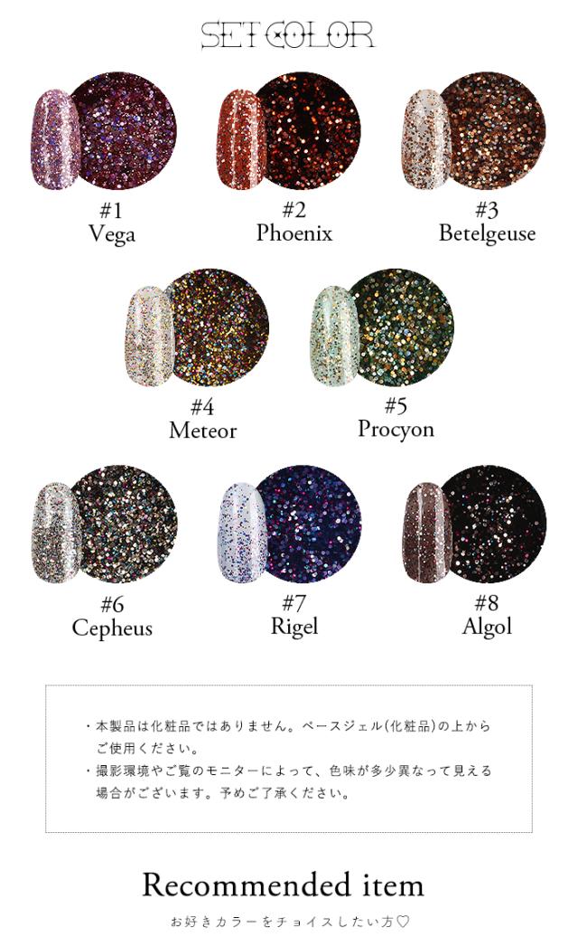 | 商品説明 | お得な全色セット カラフルなグリッターやホログラムが配合された 一味違ったキラキラ感。 それぞれ違うクリアカラーのベースに、色合いや大きさが異なる カラフルなグリッターをたっぷり入れました♪ そのままワンカラーでも、ポイント使いにしても 万能に使えるキラキラジェルです◎ |