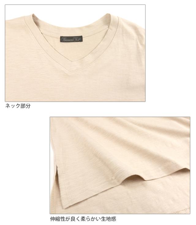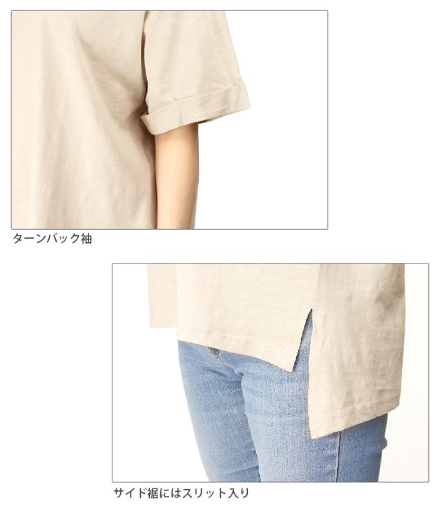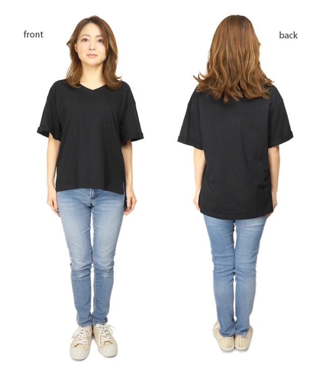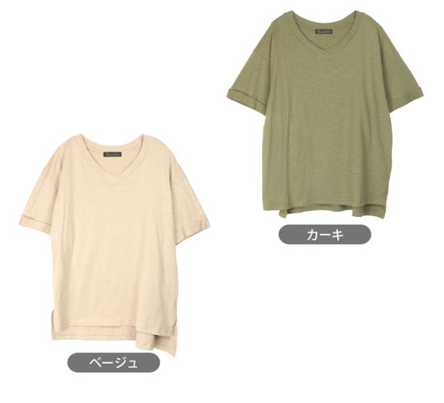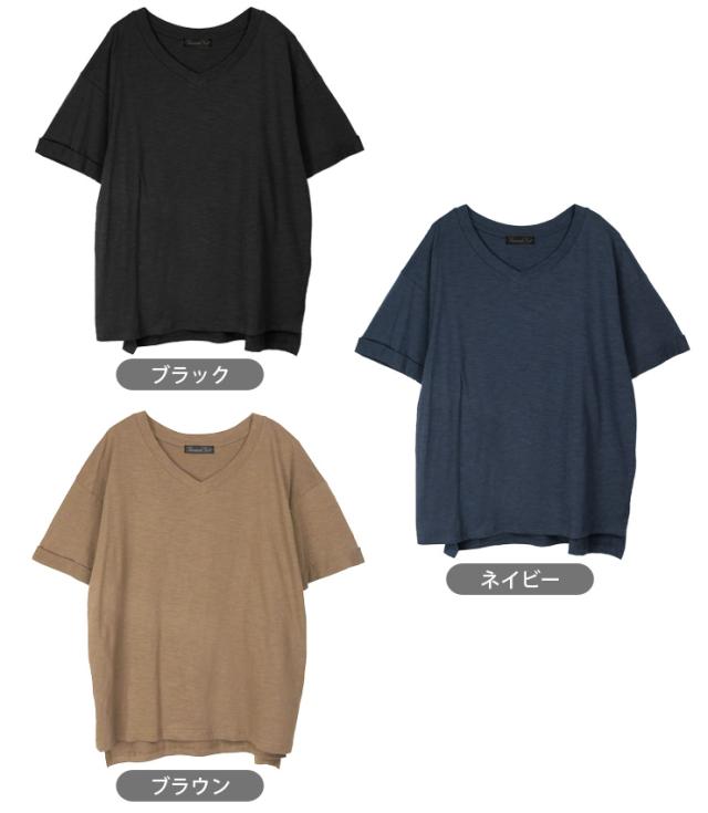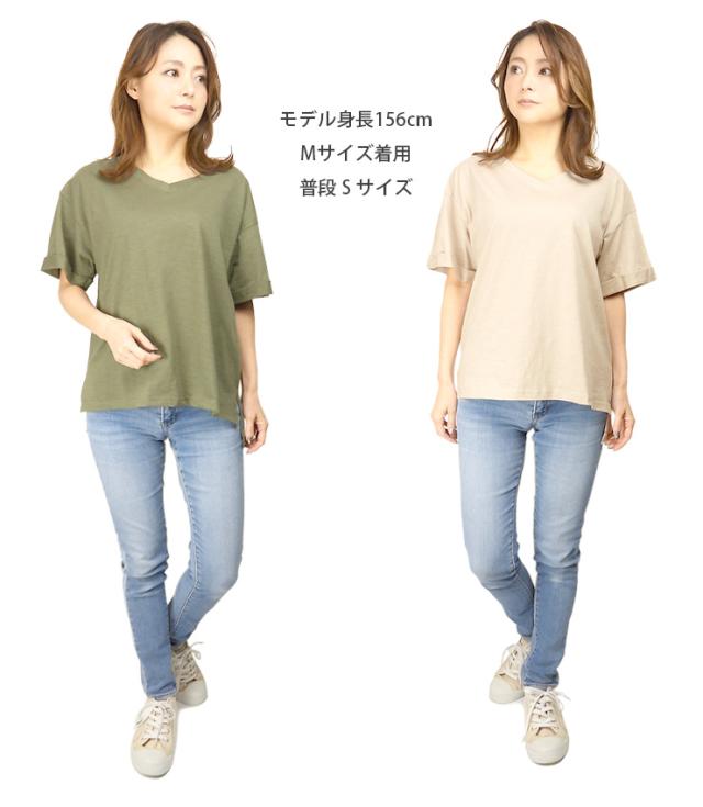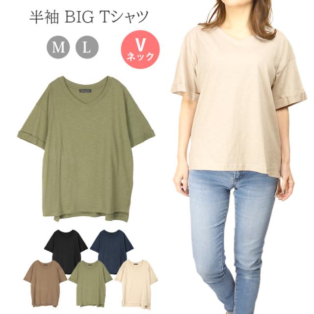 【メール便送料無料】Vネック コットン 半袖 BIG Tシャツ M L レディース 春夏秋 全5色 YN24-106-3 シンプル 無地 カットソー トップス 綿100% コットン100% 半そで ターンバック袖 黒 紺 茶 緑 ブラック ネイビー ブラウン カーキ ベージュ 2869