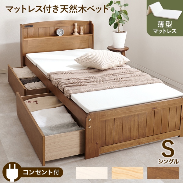 大容量収納付き すのこベッド マットレス付き 棚コンセント付き ベッド シングルベッド シングル 宮付き コンセント付き 引出し付き 引き出し 木製 天然木 天然木ベッド 収納 大容量 おしゃれ かわいい 北欧 カントリー調 ナチュラルテイスト 一人暮らし ワンルーム 子供部屋