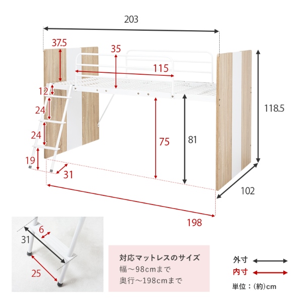 ベッド:(約)幅102×奥行203×高さ119×床面高82cm デスク:(約)幅120×奥行55×高さ72cm ワゴン:(約)幅75×奥行41×高さ72cm