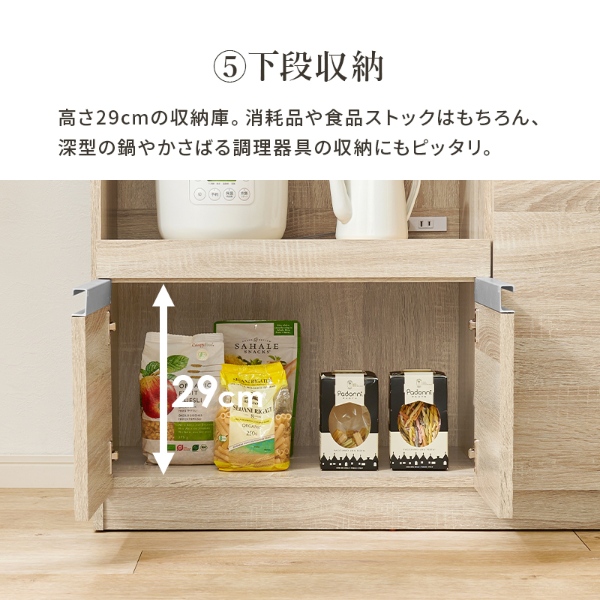 コンパクトながら多機能な収納スペースを備え、食器や調理器具、レンジ、炊飯器、ケトル、鍋などのキッチン用品から調味料や食品まで、すっきりとまとめて収納可能。