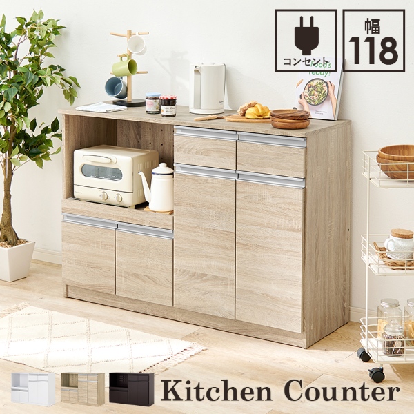 収納力に優れたキッチンカウンター 幅118cm レンジ台 キッチン 収納 ラック 棚 キッチンボード 食器棚 シンプル キッチンラック スライド棚 キッチン収納 スリム コンセント付き レンジ 炊飯器 スライドレール 可動棚 省スペース