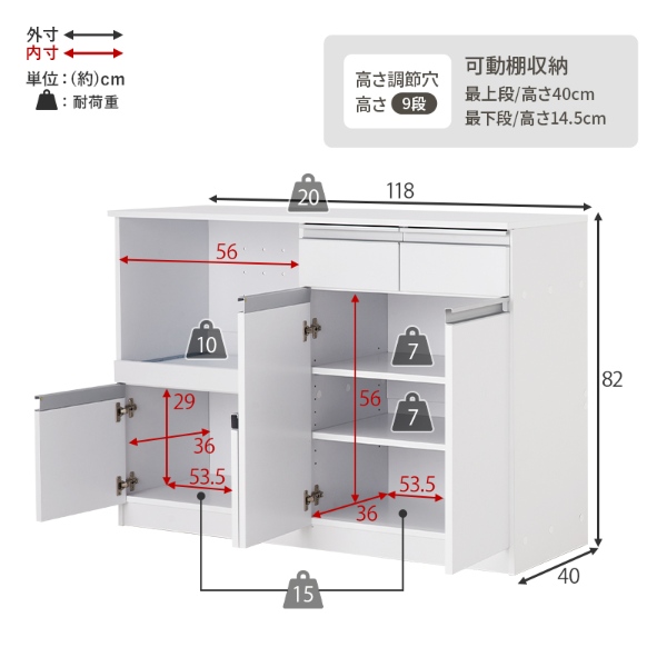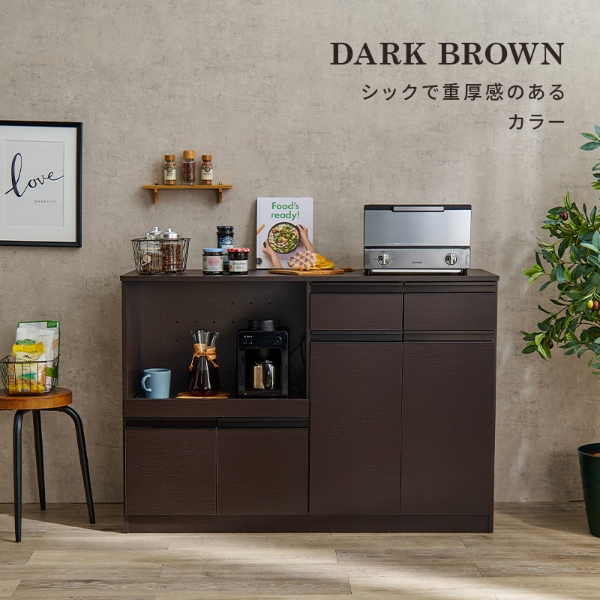 立って作業がしやすい天板高さのカウンターキャビネット。 食器や調理器具、キッチン家電がスッキリ片付く大容量収納です。 ■カラー ダークブラウン ■サイズ(約) (約)幅118×奥行40×高さ82cm ■素材 主材:プリント紙化粧パーティクルボード、天板・スライド棚:合成樹脂化粧パーティクルボード(メラミン樹脂)、取手:スチール ■備考 2口コンセント付 ■組立 お客様組立品 ■生産地 ベトナム製 ※お客様組立て品につきましては、組み立て後に不良の連絡をされても対応ができません。組み立て前にパーツに不良・傷等がないか、必ずご確認下さいますようよろしくお願い申し上げます。 ※記載は商品仕様の一部です。仕様説明不足等の理由での返品はできません。特に適合等は必ずご確認ください。