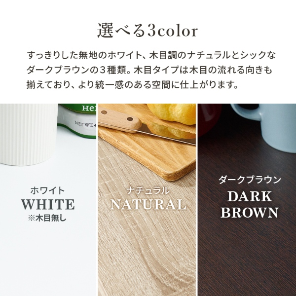 主材:プリント紙化粧パーティクルボード、天板・スライド棚:合成樹脂化粧パーティクルボード(メラミン樹脂)、取手:スチール