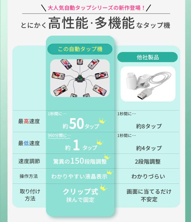 高速連打 自動タップ機 1台分セット スマホ 連打 自動 タップ 自動タップ 連打器 オートクリッカー スマートフォン 連続 放置 ゲーム スマホゲーム クリッカーゲーム ライブ配信 いいね 配信 クリップ 速度調整 充電 電動 挟む iPhone iPad Android SNS
