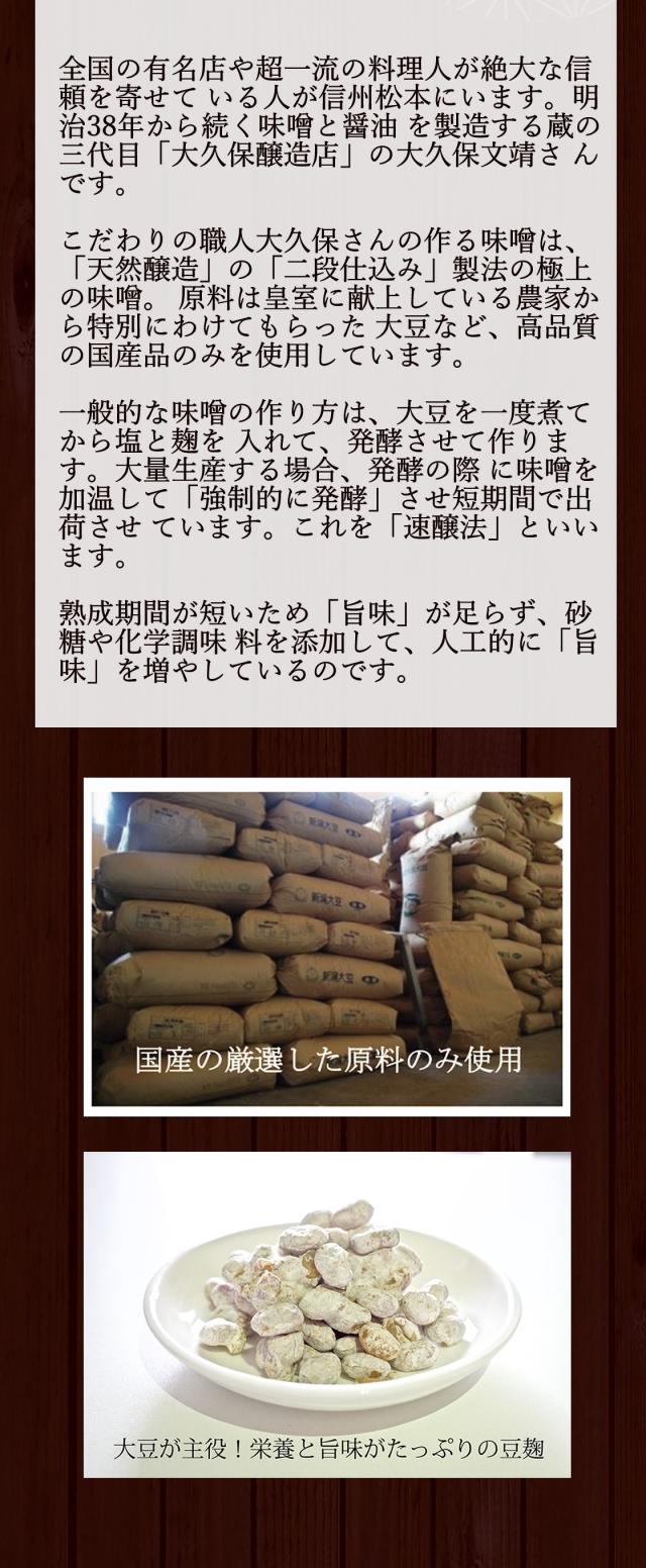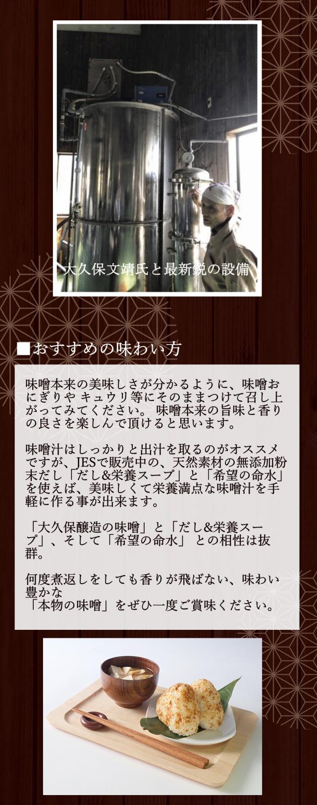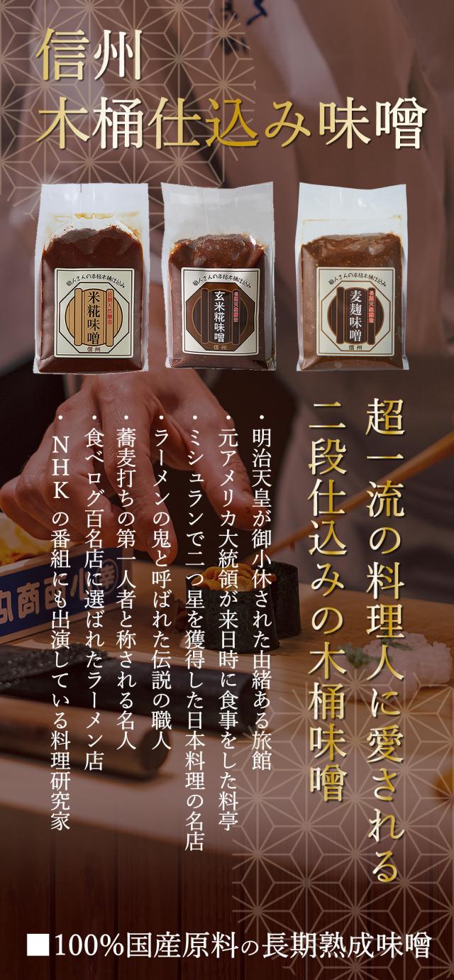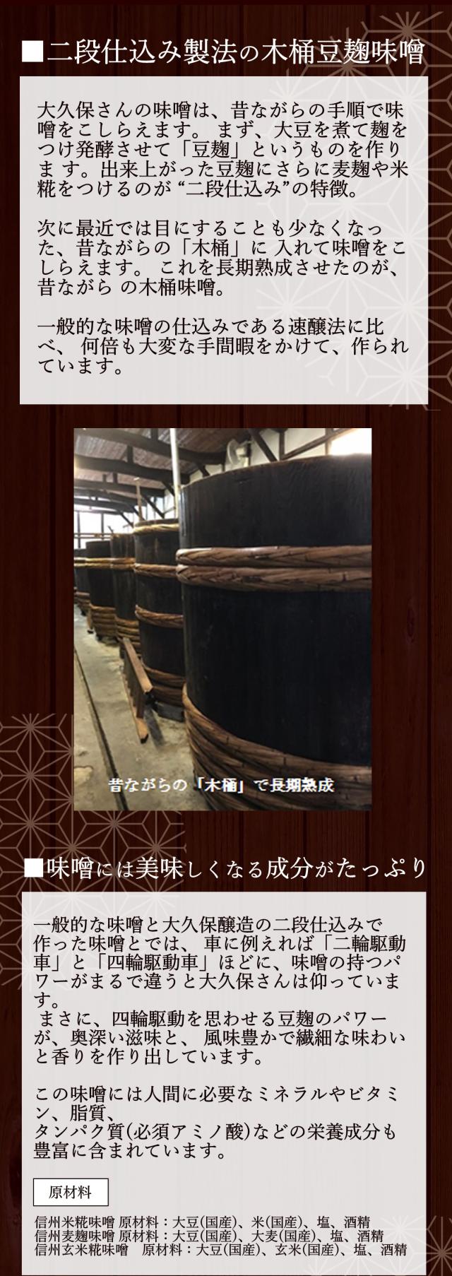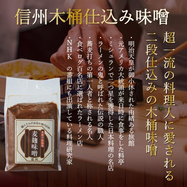 大豆と大麦別々に麹付けするというこだわりの製法で、 信州産らしい甘さ控えめで昔ながらの濃厚な香りと風味と旨味が引き出された味噌です。