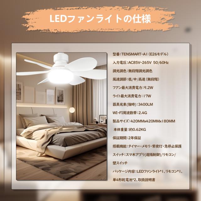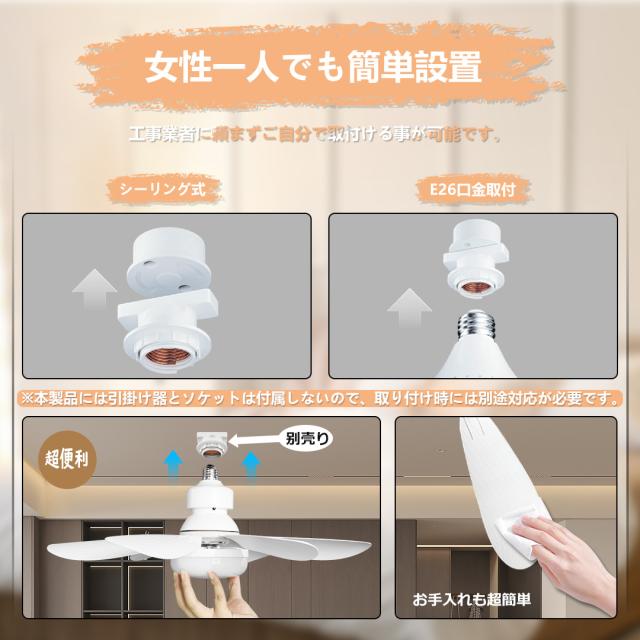 - 「ファン」と「LED照明」を融合した画期的な新作です。天井に簡単に設置するだけで、涼しい風を送り出すファン機能と明るくて快適な光を放つLED照明機能を同時に利用できます。 高い循環効率により、部屋の温度差を解消し、快適な室温を保つことが可能です。