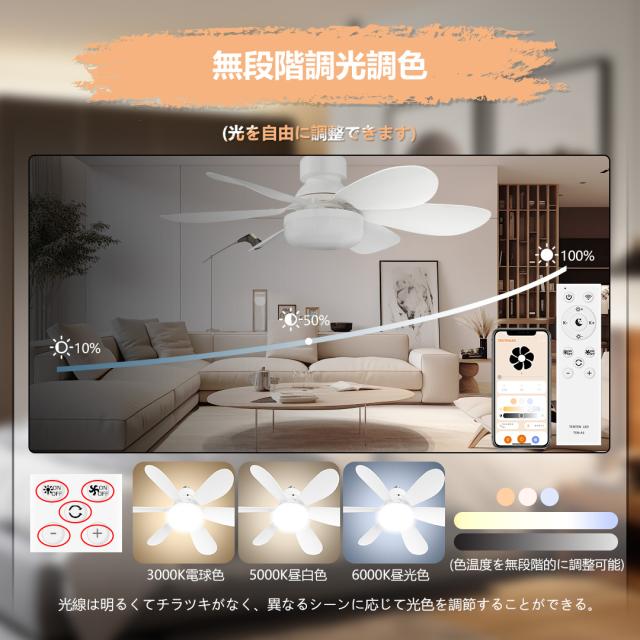 - LEDファンライトに付属する専用リモコンは、便利さを極めた万能ツールです。照明部分では、LEDライトの電源をオン・オフするだけでなく、調光調色も無段階で自在に調整できます。部屋の雰囲気に合わせて明るさや色温度を変えることができます。ファン部分に関しても、電源のオン・オフはもちろん、風量を5段階に分けて調節することができます。
