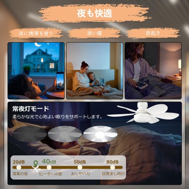 - 本製品はDCモーターを採用することで、静音性能が飛躍的に向上しています。寝室や書斎など、静けさが求められる場所でも、騒音に煩わされることなく快適に使用できます。また、常夜灯機能が付いており、弱い明かりで部屋を照らすことができ、暗闇に怯える子供に安心感を与えたり、夜中のトイレへの移動時などに転倒の危険性を減らすことができます。