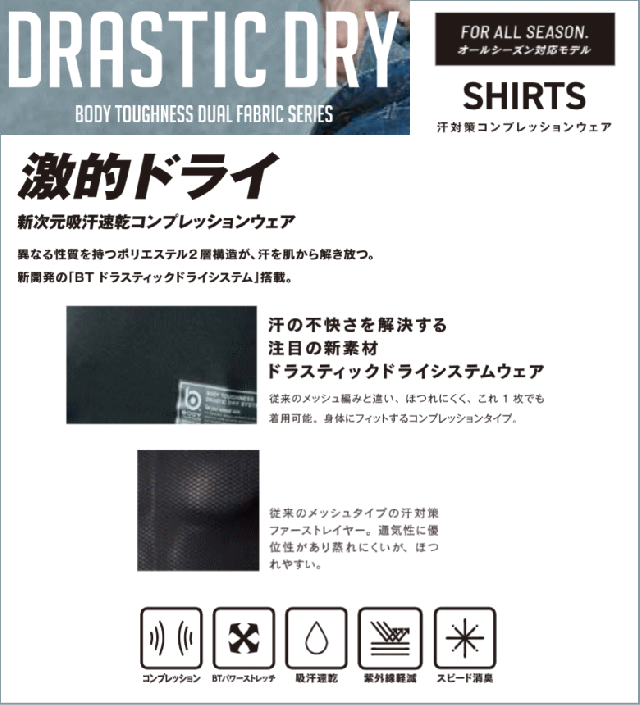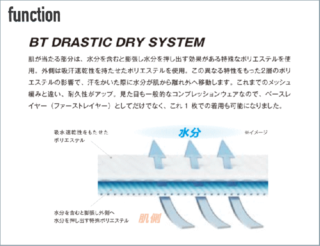 ・BT DRASITC DRY SYSTEM:肌が当たる部分は、水分を含むと膨張し水分を押し出す効果がある特殊なポリエステルを使用。外側は吸汗速乾性を持たせたポリエステルを使用。この異なる特性を持った2層のポリエステルの影響で、汗をかいた際に水分が肌から離れ外へ移動します。これまでのメッシュ編みと違い、耐久性がアップ。見た目も一般的なコンプレッションウェアなので、ベースレイヤー(ファーストレイヤー)としてだけでなく、これ1枚での着用も可能になりました