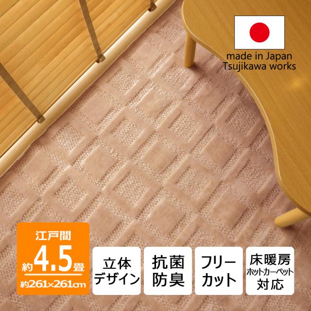 カーペット ラグ 立体デザイン ホスタ 江戸間 4畳半 4.5畳 261×261cm サイズ ベージュ リップルループ 四畳半 日本製 床暖対応 オールシーズン 絨毯 じゅうたん 抗菌防臭 畳上 正方形 フリーカット ハサミ 切れる 国産 辻川産業株式会社 Tsujikawa