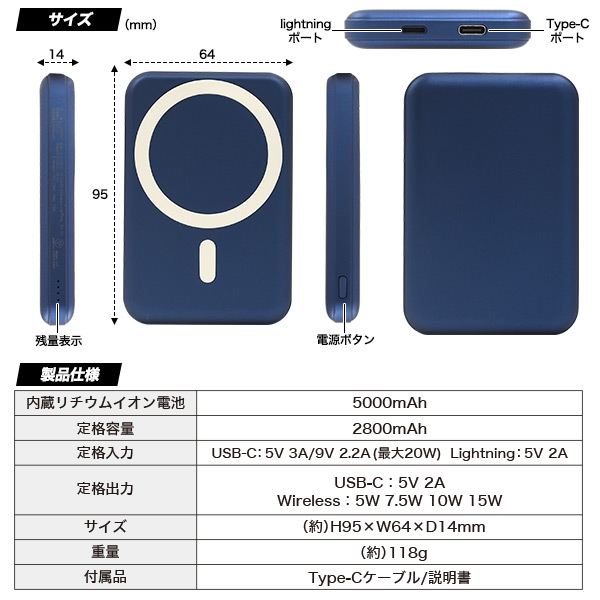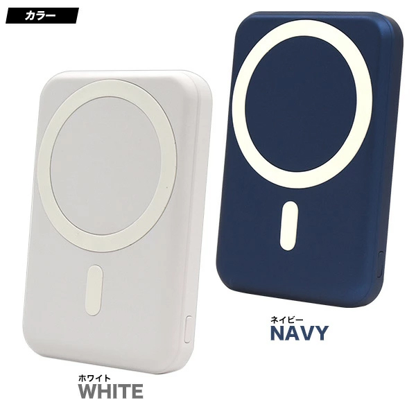 持ち運びが便利な5000mAhのマグネット付きワイヤレス充電対応モバイルバッテリーです。