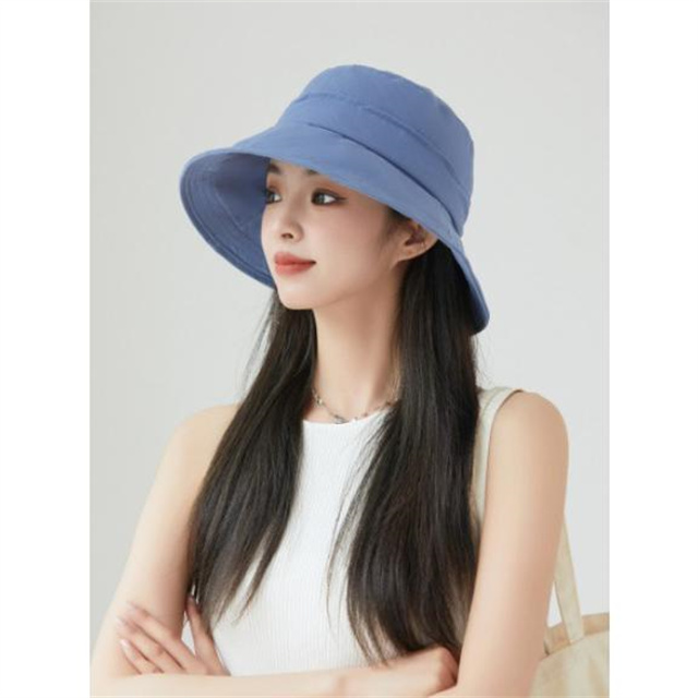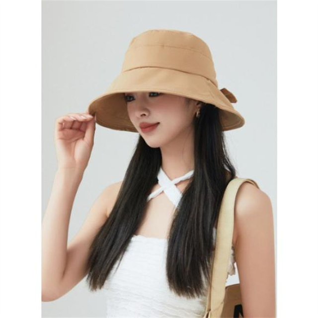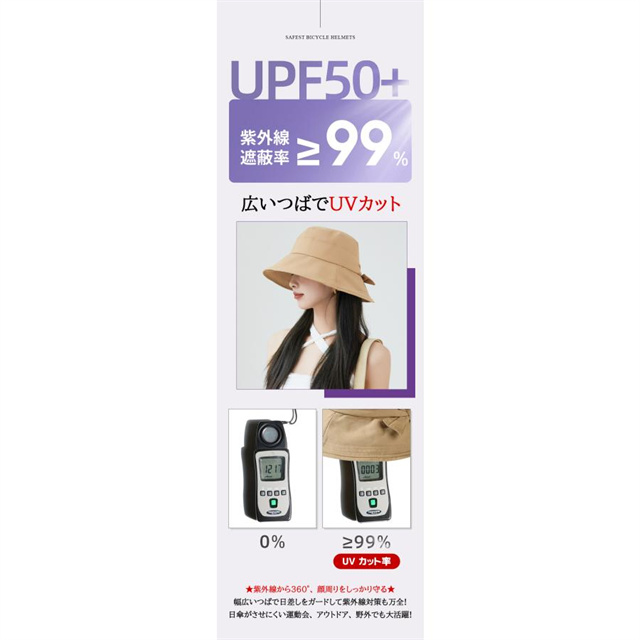 - 幅広いつばで360°紫外線から顔周りをしっかり守る。